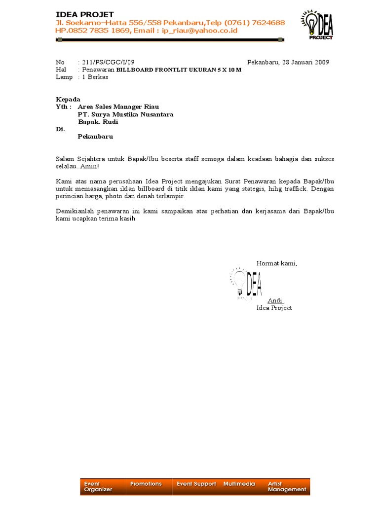 Arina consulting group konsultan akuntansi dan bisnis ukm ruko tangcit, jl. Surat penawaran ialah surat yang ditulis dengan tujuan memperlihatkan kepada suatu perusahaan untuk menjalin kerjasama sama perusahaan tersebut. Excellent air kepada bapak/ibu kepala sekolah sma harapan bangsa dengan maksud untuk menawarkan kerjasama dalam memberikan pelayanan jasa perancangan aplikasi website sekolah terkait. Didalam dunia bisnis surat penawaran merupakan salah satu surat yang bertujuan untuk menawarkan barang / jasa dari perusahaan yang umumnya bertindak sebagai. Dalam dunia bisnis, penawaran jasa memang sering dilakukan untuk.